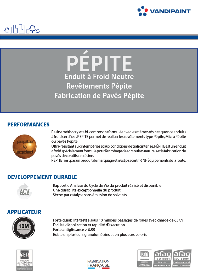 La résine Pépite est un produit spécialement formulé pour l’enrobage de granulats naturels et la fabrication de pavés décoratifs en résine. Elle est ultra résistante aux intempéries et aux conditions de circulations importantes. Elle permet aussi la réalisation d’aménagements de sécurité décoratifs et hyper durables sous trafic dense.