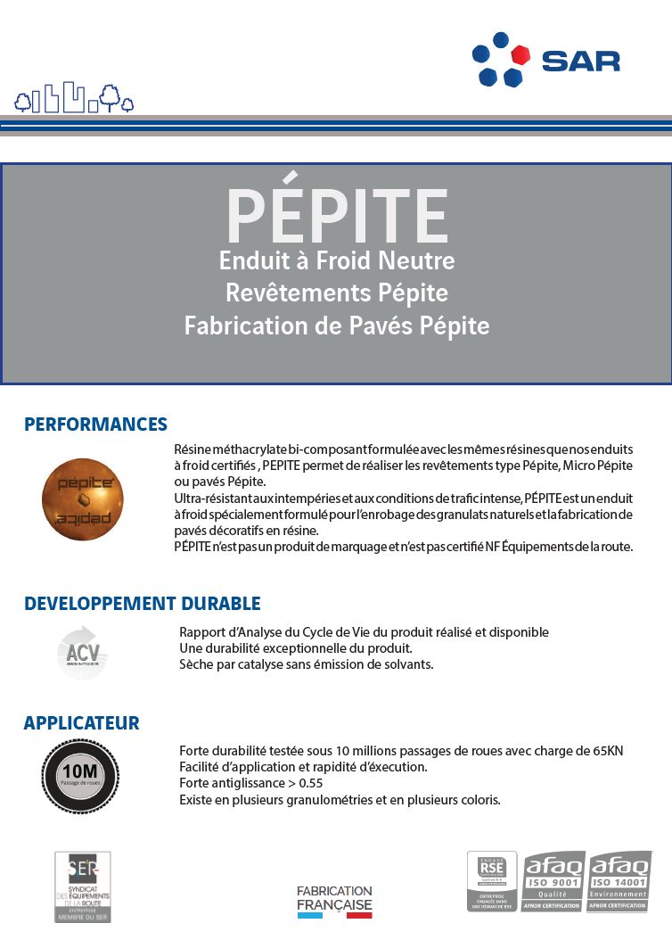 La résine Pépite est un produit spécialement formulé pour l’enrobage de granulats naturels et la fabrication de pavés décoratifs en résine. Elle est ultra résistante aux intempéries et aux conditions de circulations importantes. Elle permet aussi la réalisation d’aménagements de sécurité décoratifs et hyper durables sous trafic dense.