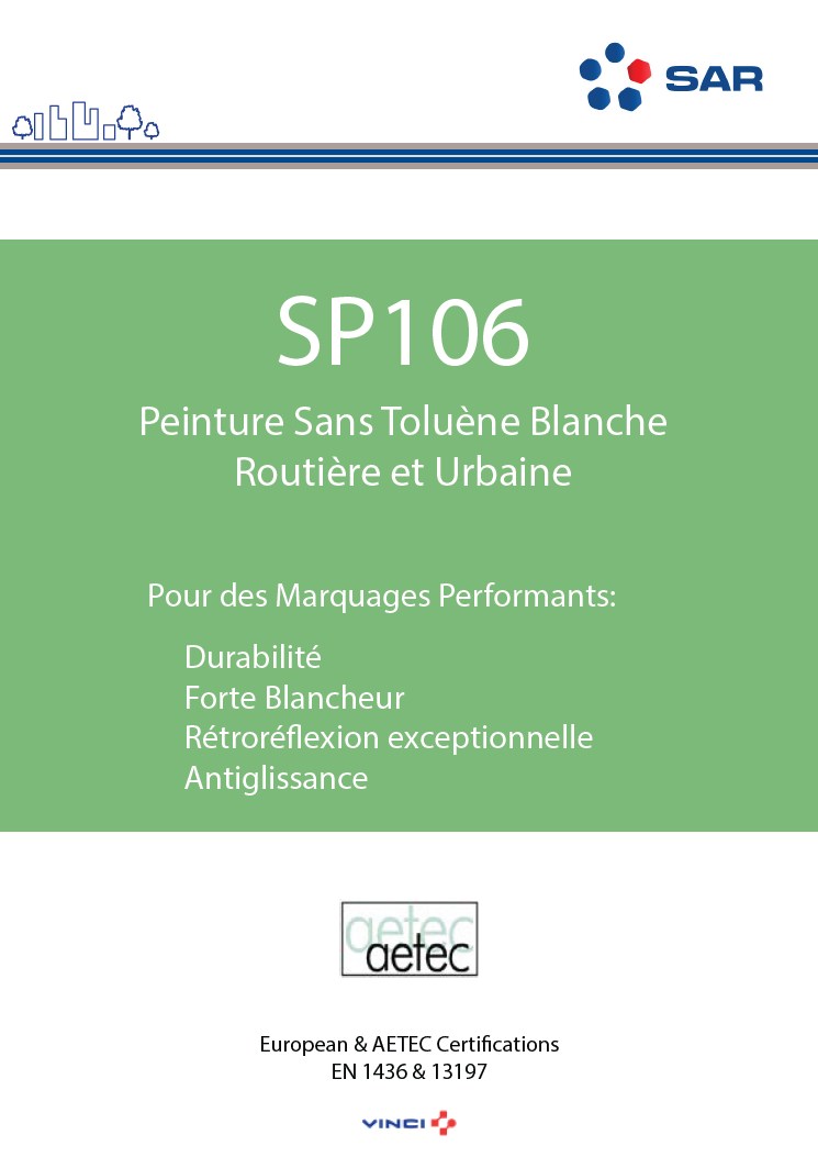 La SP106 est une peinture solvantée sans toluène certifiée AETEC (Association pour l’Étude des Technologies d’Équipement des Routes) laboratoire d’essais techniques spécialisé dans les matériaux de signalisation routière horizontale. Reconnue par l’ENAC (Entité Nationale d’Accréditation) pour ses tests selon les normes européennes) pour la réalisation des marquages routiers et urbains, avec des performances exceptionnelles en termes de durabilité.