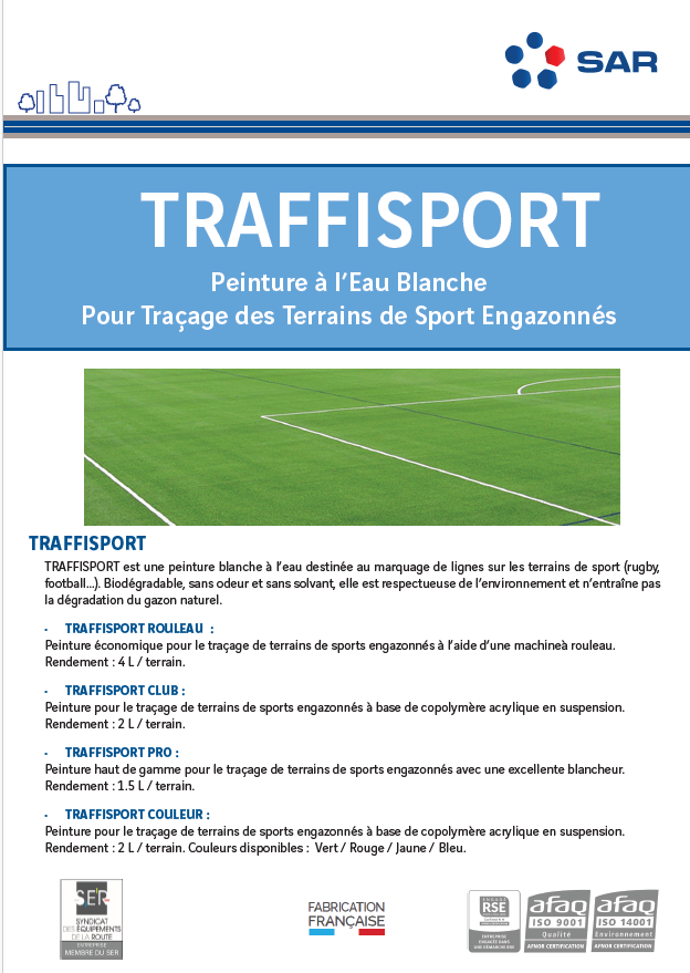 Traffisport est une peinture blanche à l’eau, destinée au marquage de lignes sur les terrains de sport (rugby, football, …). Biodégradable, sans odeur et sans solvant, elle est respectueuse de l’environnement et n’entraîne pas la dégradation du gazon naturel.