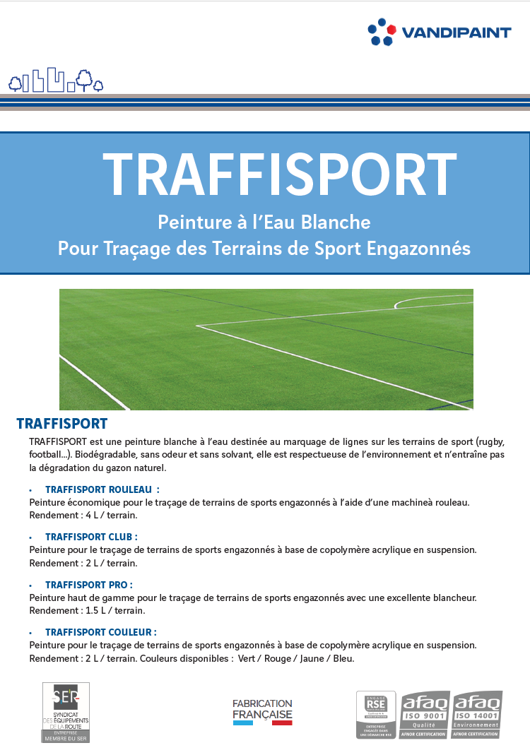 Traffisport est une peinture blanche à l’eau, destinée au marquage de lignes sur les terrains de sport (rugby, football, …). Biodégradable, sans odeur et sans solvant, elle est respectueuse de l’environnement et n’entraîne pas la dégradation du gazon naturel.