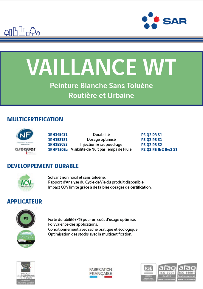 La Vaillance WT, avec sa multi-certification en traditionnel, P2B avec ou sans VNTP, est une peinture spécialement adaptée aux travaux sous balisage mobile.